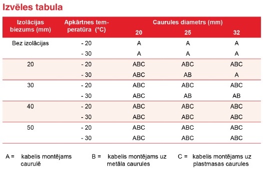 - Jauda 5°C uz metāla caurules: 10W/m,